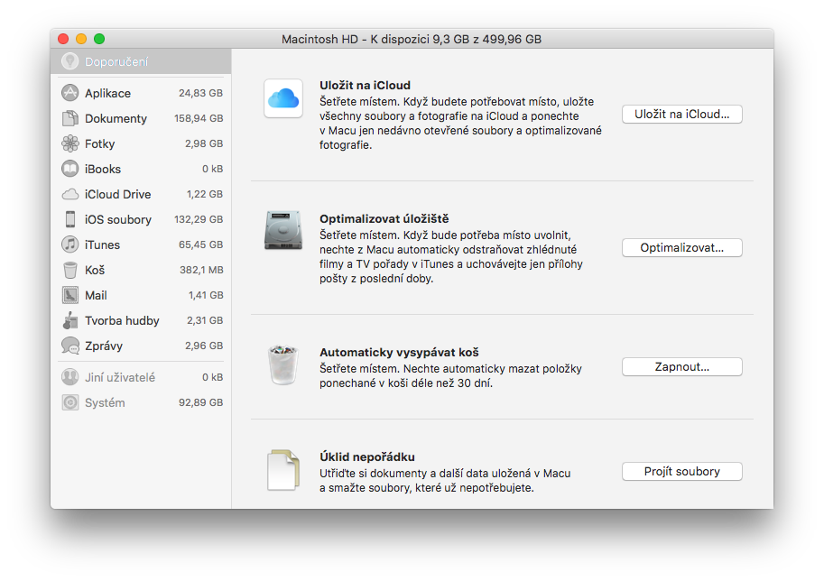 - po jejím rozkliknutí vám nabídne doporučení k optimalizaci volného prostoru. Pokud už některá doporučení využíváte, uvidíte jich o to méně. V základu se zde nacházejí čtyři možnosti: Uložit na iCloud, Optimalizovat úložiště, Automaticky vysypávat koš a Úklid nepořádku